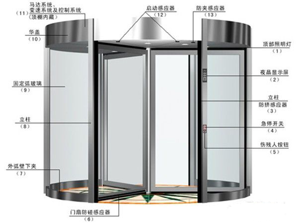 三翼旋轉門誕生于一種全新的構思和功能之中。簡單實用,安全穩定,它將旋轉通道體系和較大旋轉直徑容為一體,同時滿足了“較大程度的通行量”與“完美無缺的除風效果”這兩個相對立的條件,進而使典雅的設計與產品的安全高度統一,形成一種具有劃時代意義的新型門戶體系。三翼旋轉門結合安全性和實用性,將用戶的安全置于首位。安全擠壓開關安裝在曲壁立柱上,防止行人被靜止的立柱和旋轉的門扇積壓。寬敞的通行空間與典雅的外觀設計,內部空氣流出量比普通門少,有效的抵御了外部風、灰塵、垃圾的進入,可大幅度改善樓宇的室內環境。節省出入口空間,能獲取更寬大的有效面積。具備預定位置停止的功能,美觀大方。有自動旋轉方式和具人工操作感覺的半自動方式。頂部裝有鐳射頂燈,開關可人工控制。具備旋轉速度控制機能,即使遇到強風,也能安全進出。具備逆旋轉剎車機能,安全確保單側旋轉。